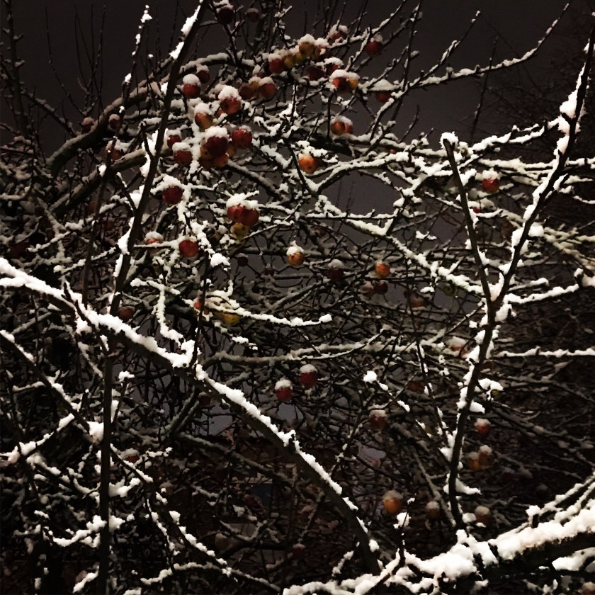 Ieri dimineata, in drum spre muncutz, in lumina rasaritului si a zapezii, un pom cu mere: culoare pe fond de argint, optimism, forta, singuratate, vara in suflet… la intoarcere, se bagase sub plapuma: